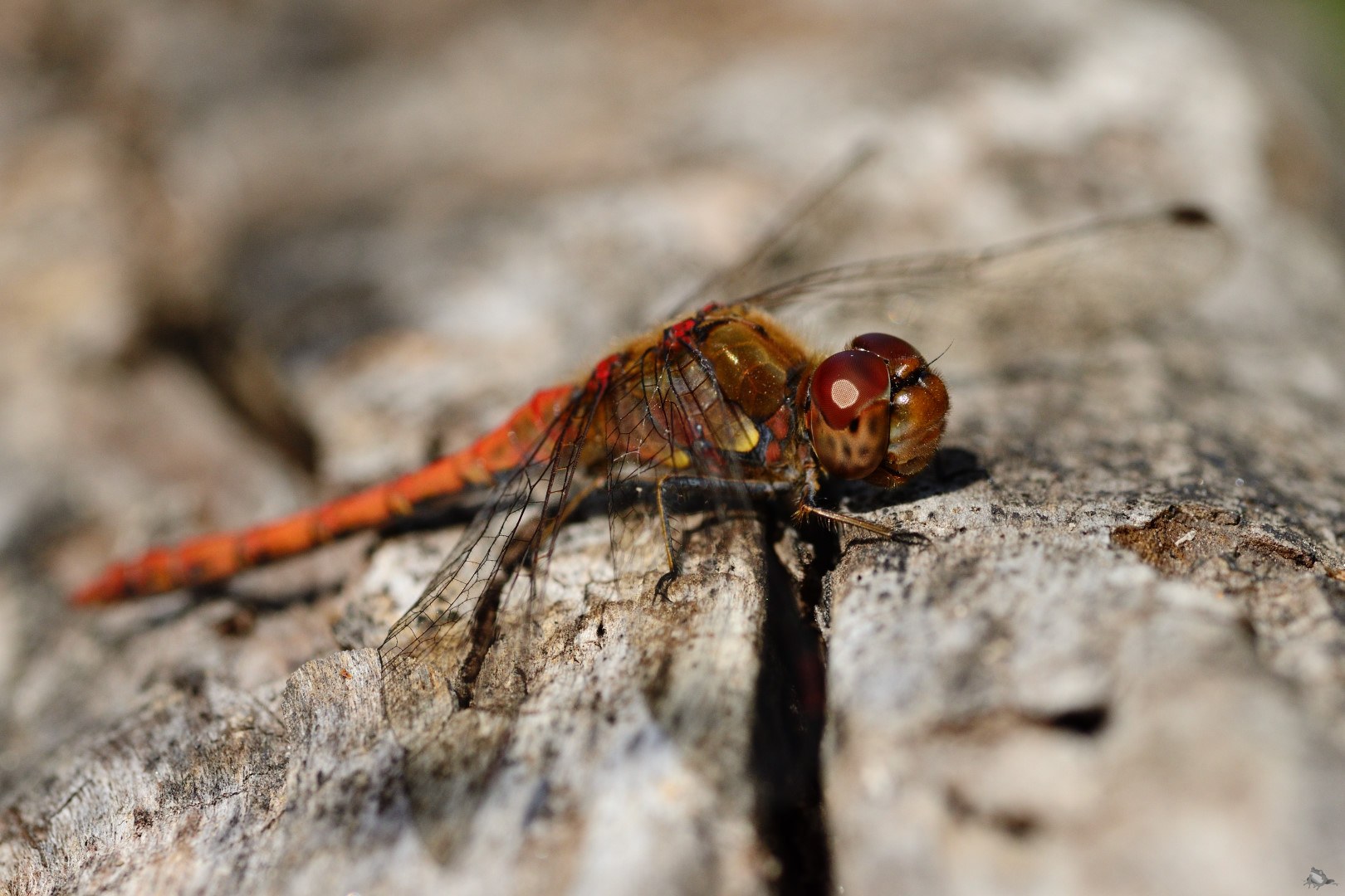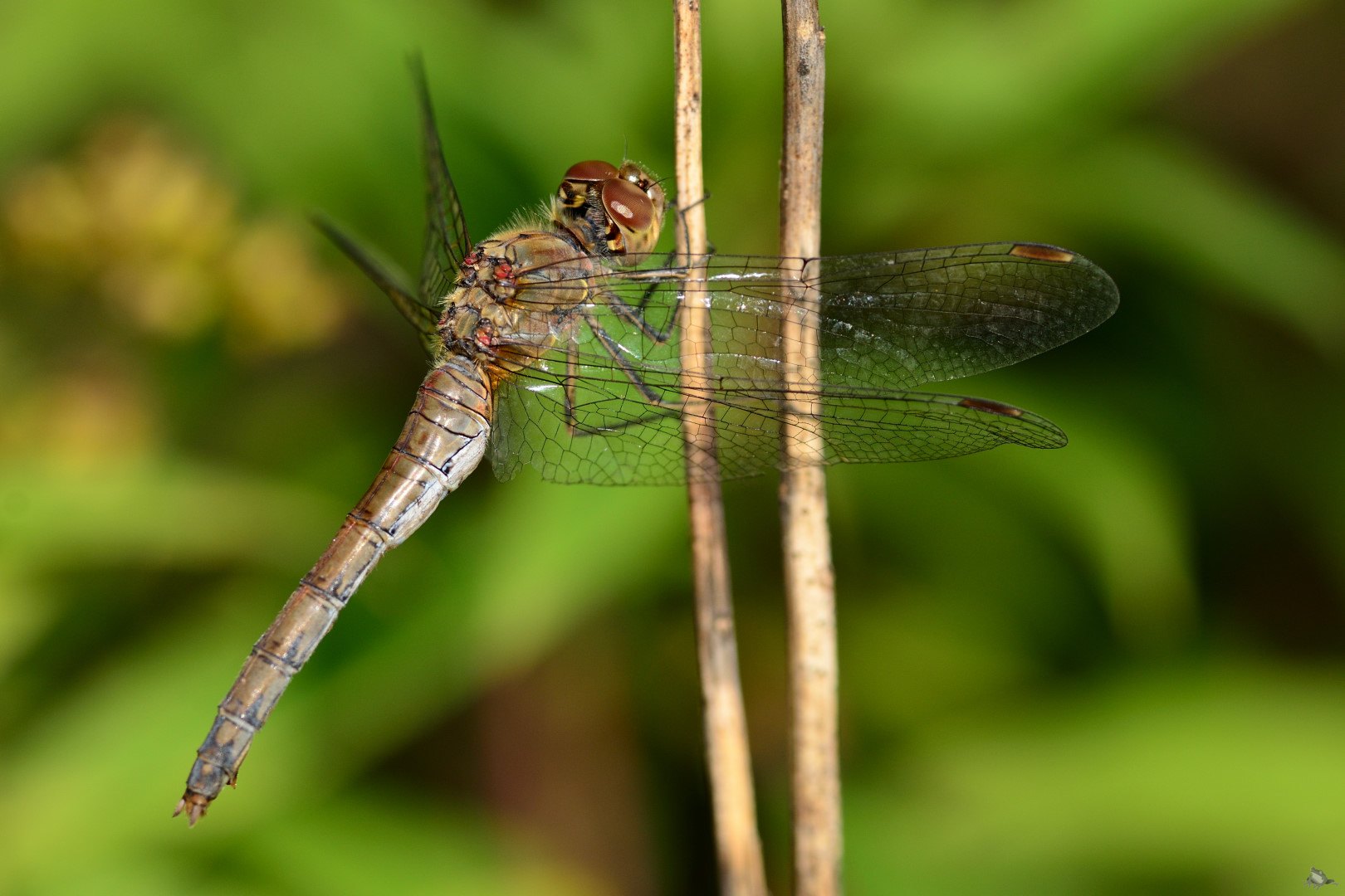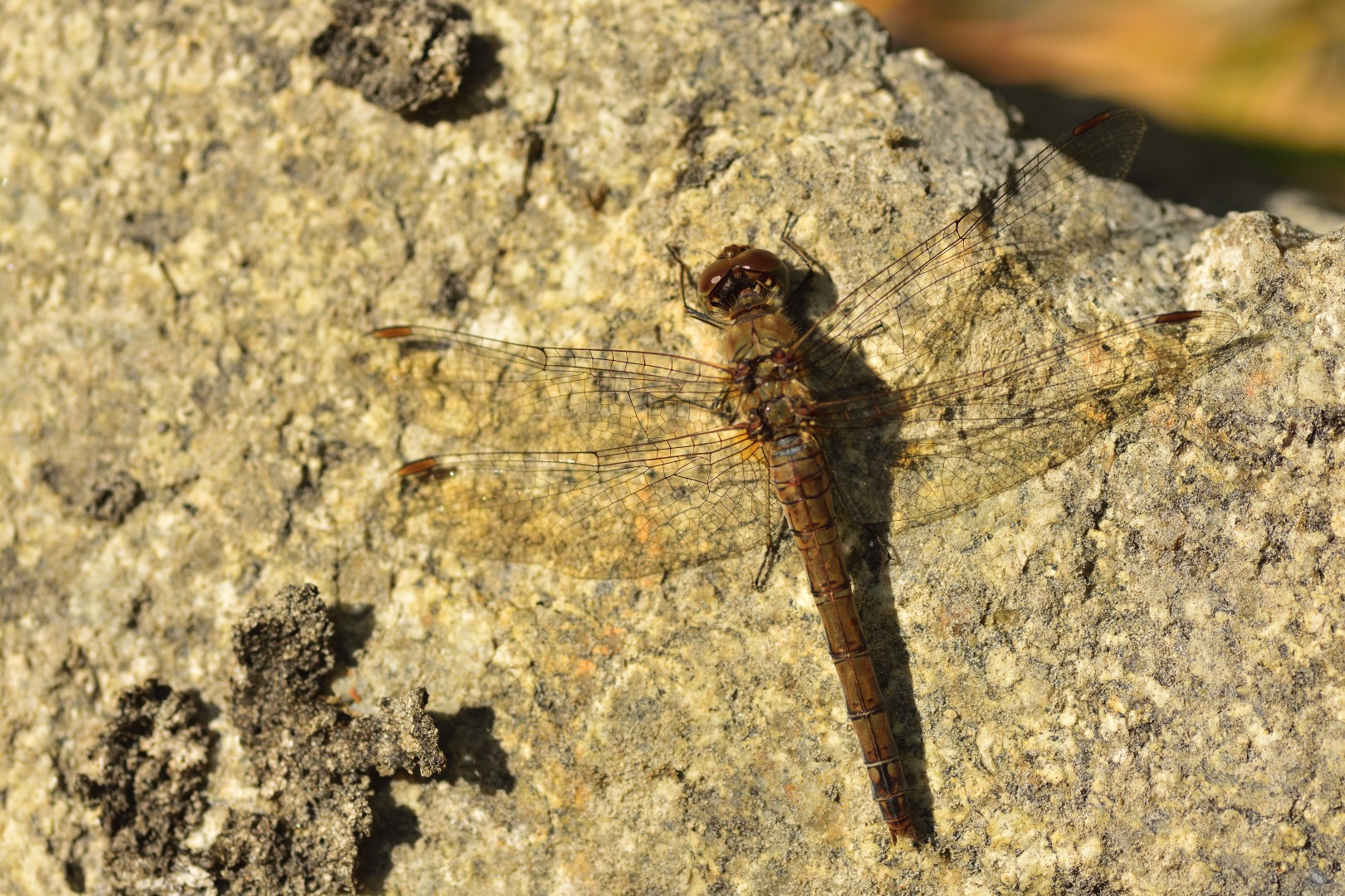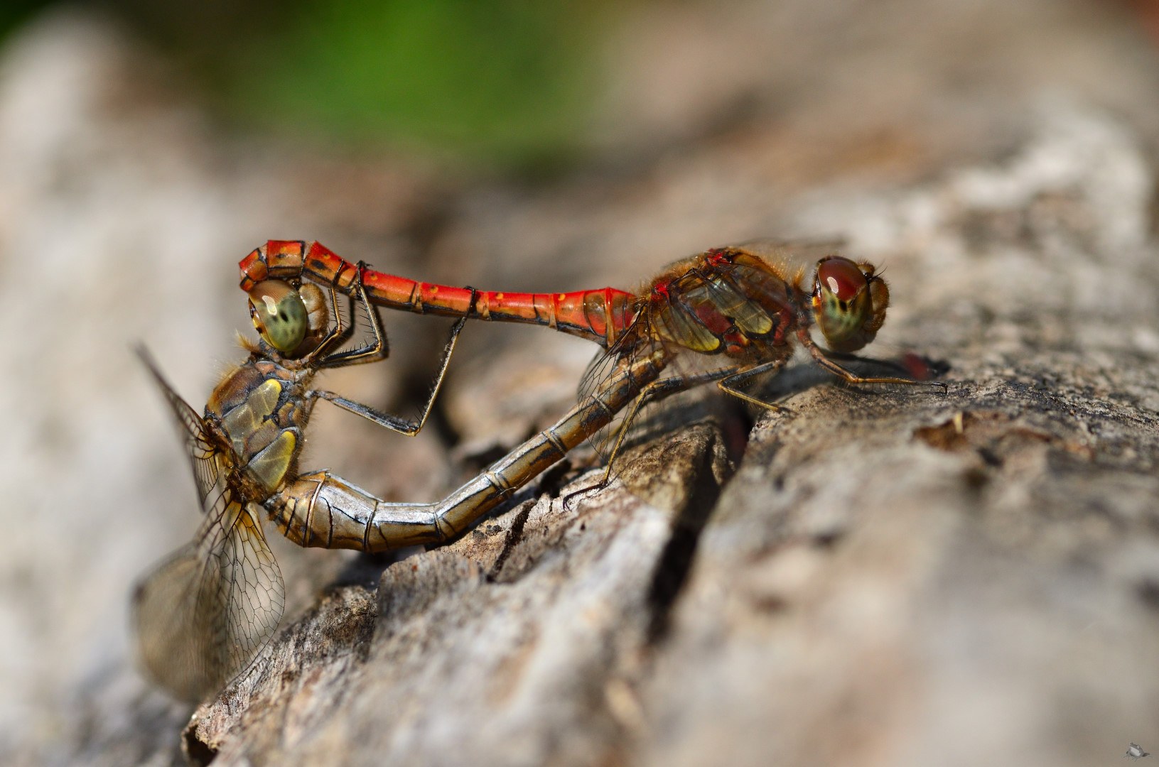 Die Große Heidelibelle (Sympetrum striolatum) verdankt ihren Namen der Tatsache, dass in Deutschland sie die größte unter den Heidelibellen ist, aber in Wirklichkeit recht klein ist. Sie wird maximal 44mm groß! Sie ist sehr leicht mit der Gemeinen Heidelibelle (Sympetrum vulgatum) zu verwechseln. Der Hauptunterschied ist die schwarze Färbung auf der Stirn, die bei der Gemeinen Heidelibelle bis zur Hälfte des Augenrandes verläuft und bei der Großen Heidelibelle nicht. Da ihre Beine schwarz gelb gestreift sind kann man sie mit Sympetrum sanguineum (schwarze Beine) nicht verwechseln.