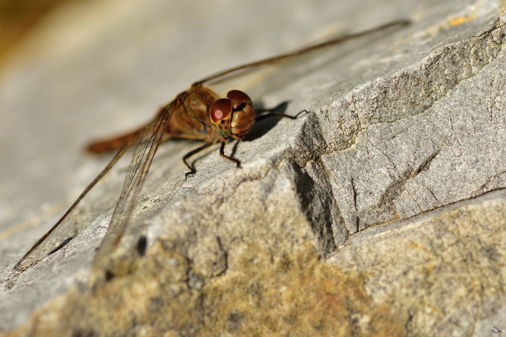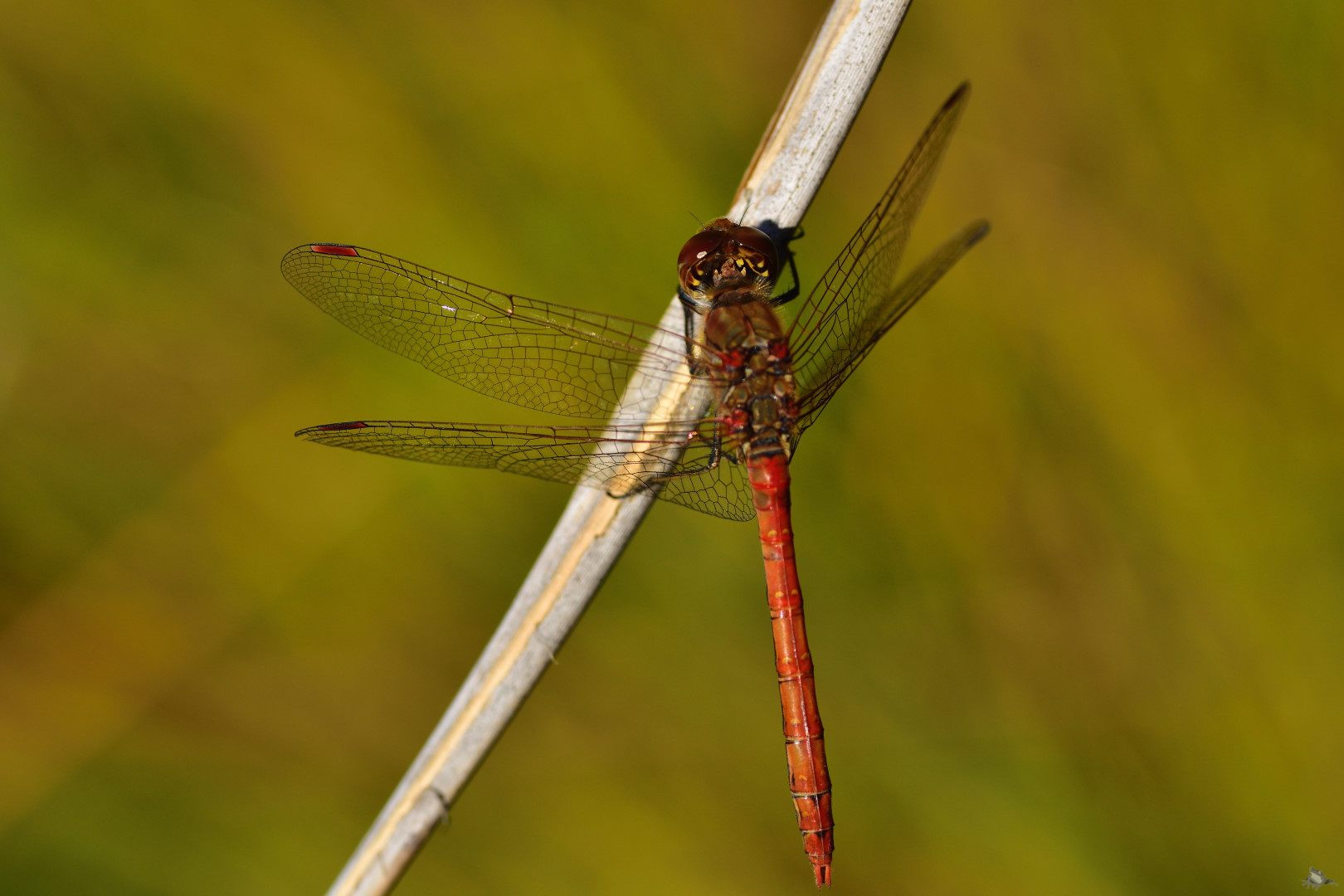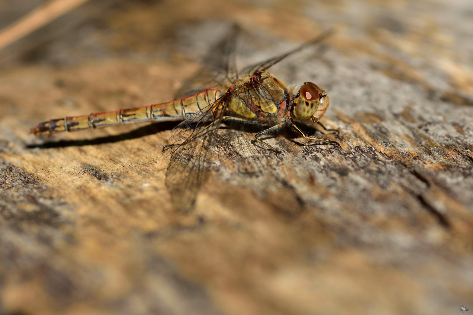 Die Große Heidelibelle (Sympetrum striolatum) verdankt ihren Namen der Tatsache, dass in Deutschland sie die größte unter den Heidelibellen ist, aber in Wirklichkeit recht klein ist. Sie wird maximal 44mm groß! Sie ist sehr leicht mit der Gemeinen Heidelibelle (Sympetrum vulgatum) zu verwechseln. Der Hauptunterschied ist die schwarze Färbung auf der Stirn, die bei der Gemeinen Heidelibelle bis zur Hälfte des Augenrandes verläuft und bei der Großen Heidelibelle nicht. Da ihre Beine schwarz gelb gestreift sind kann man sie mit Sympetrum sanguineum (schwarze Beine) nicht verwechseln.