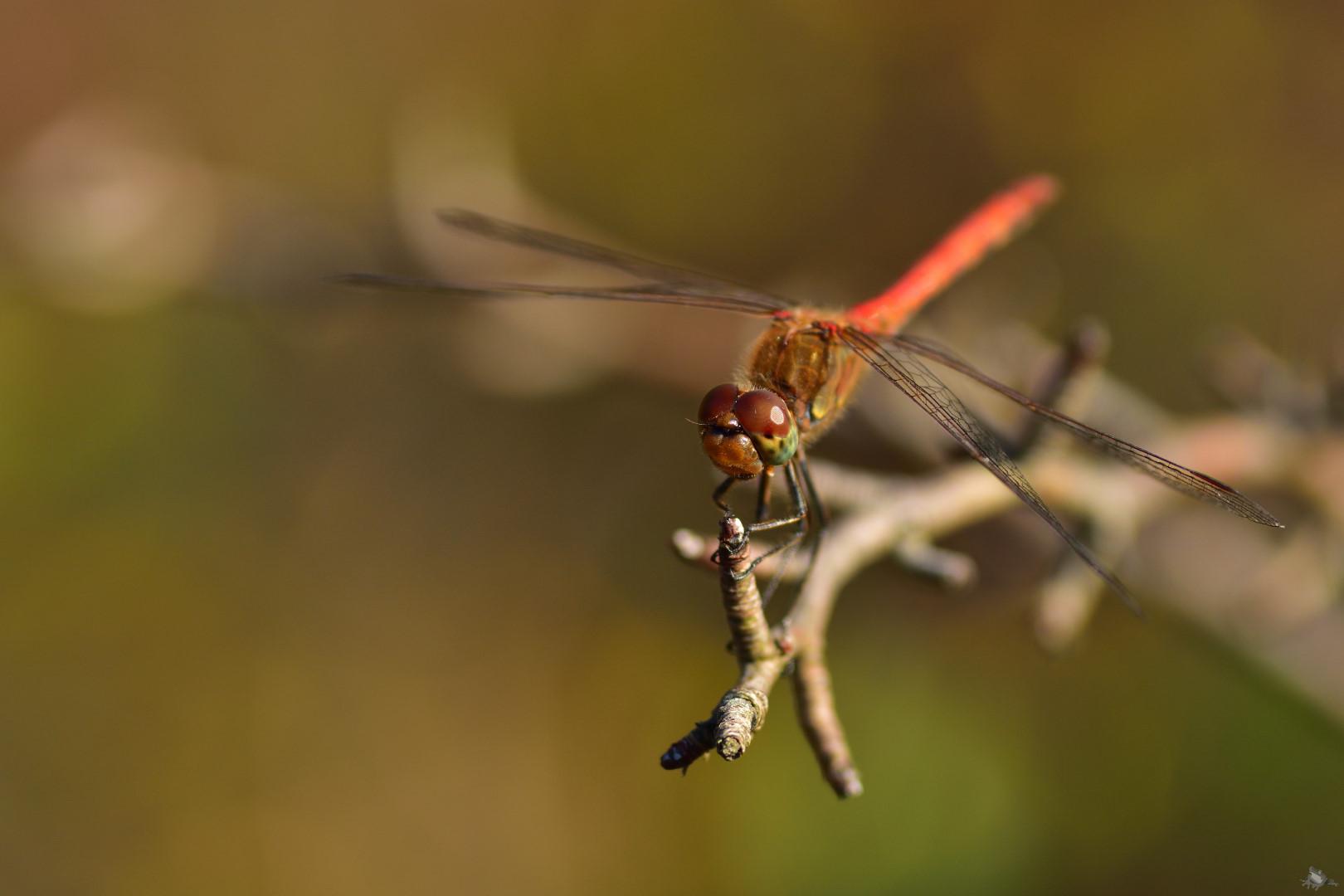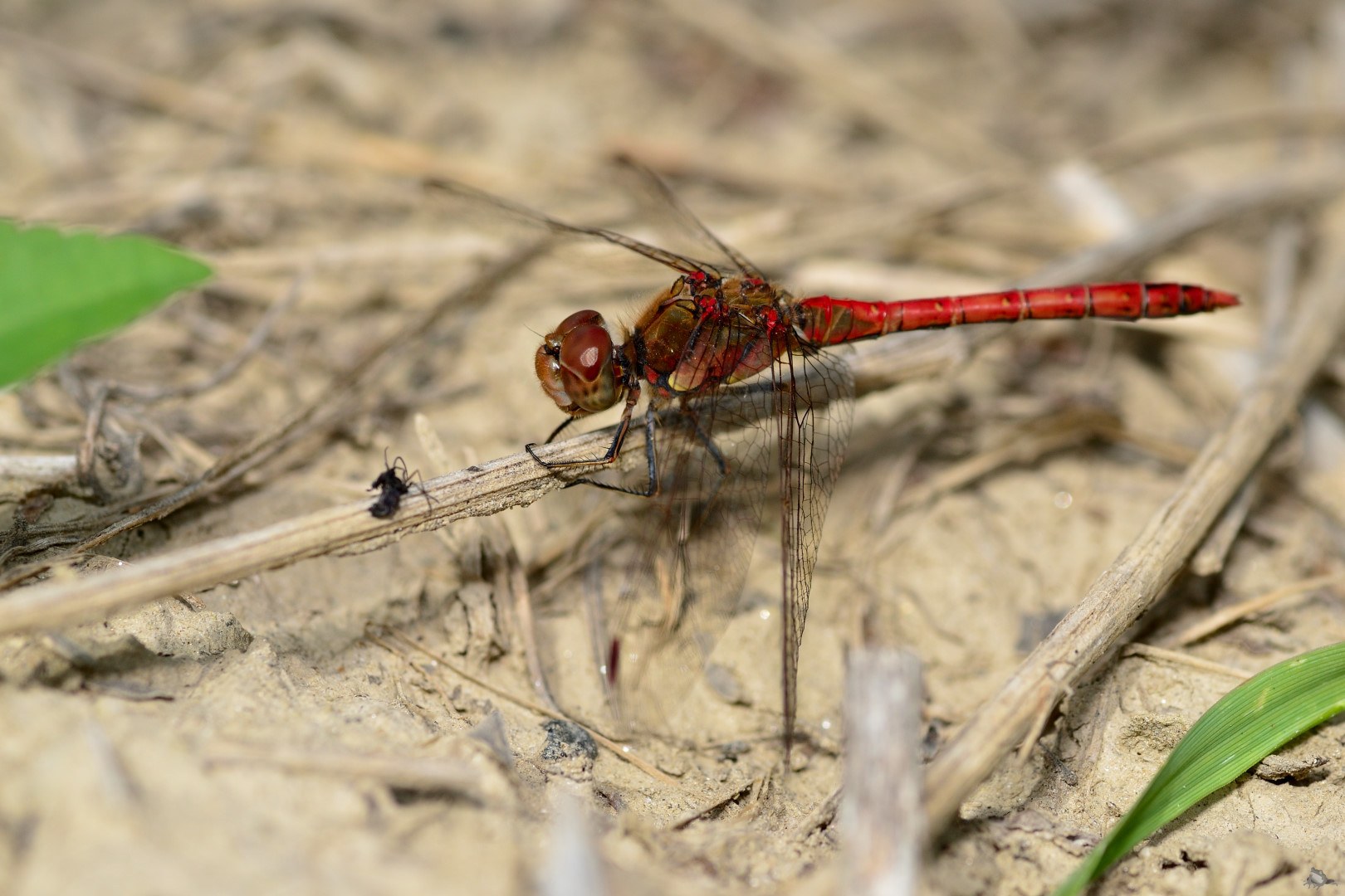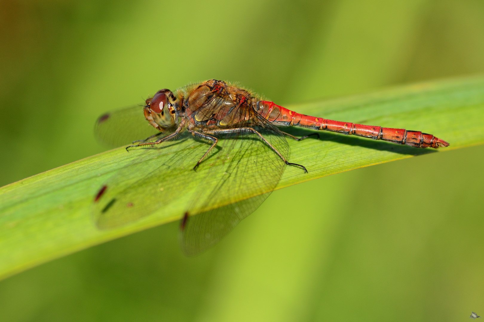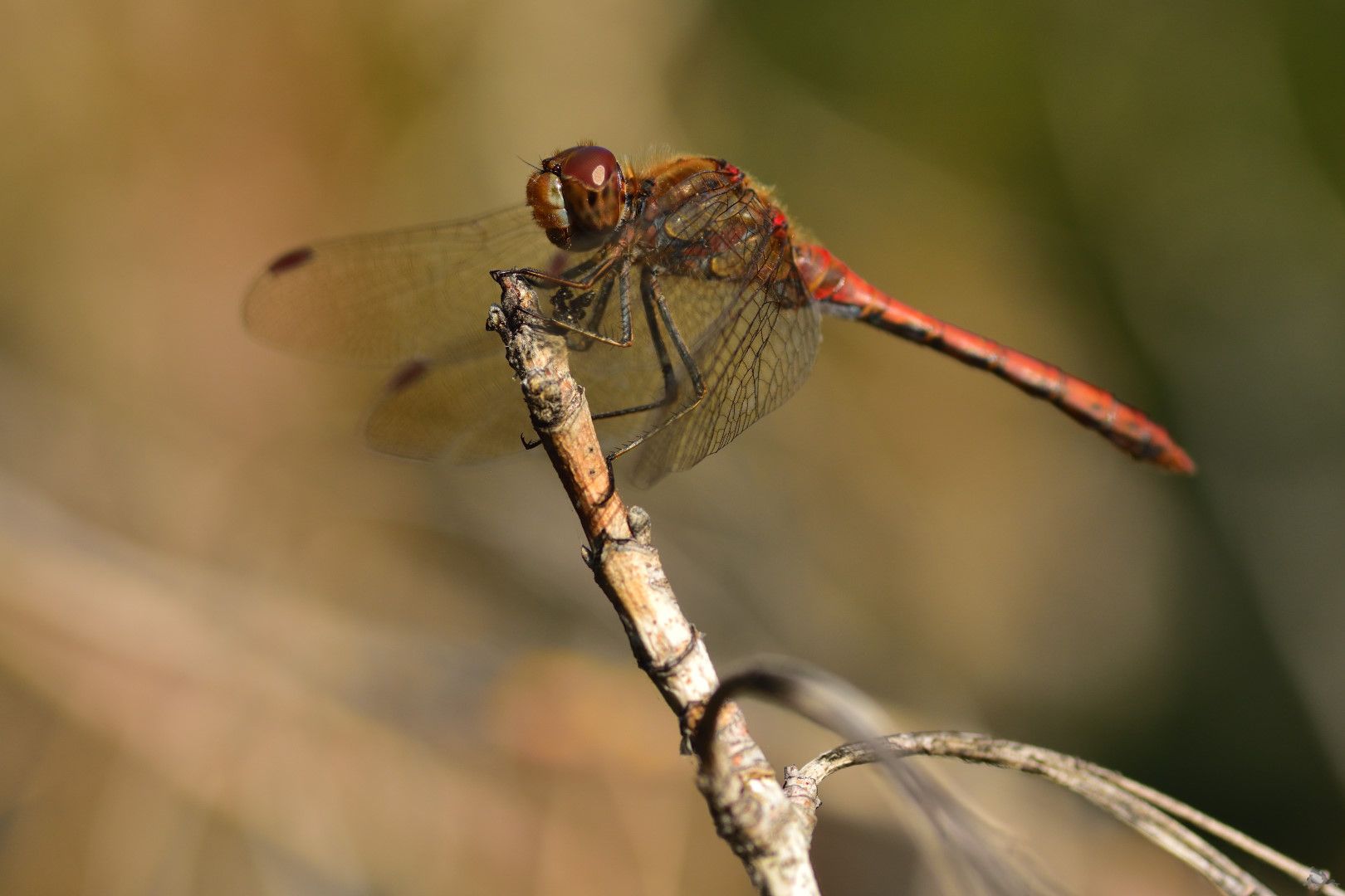 Die Große Heidelibelle (Sympetrum striolatum) verdankt ihren Namen der Tatsache, dass in Deutschland sie die größte unter den Heidelibellen ist, aber in Wirklichkeit recht klein ist. Sie wird maximal 44mm groß! Sie ist sehr leicht mit der Gemeinen Heidelibelle (Sympetrum vulgatum) zu verwechseln. Der Hauptunterschied ist die schwarze Färbung auf der Stirn, die bei der Gemeinen Heidelibelle bis zur Hälfte des Augenrandes verläuft und bei der Großen Heidelibelle nicht. Da ihre Beine schwarz gelb gestreift sind kann man sie mit Sympetrum sanguineum (schwarze Beine) nicht verwechseln.